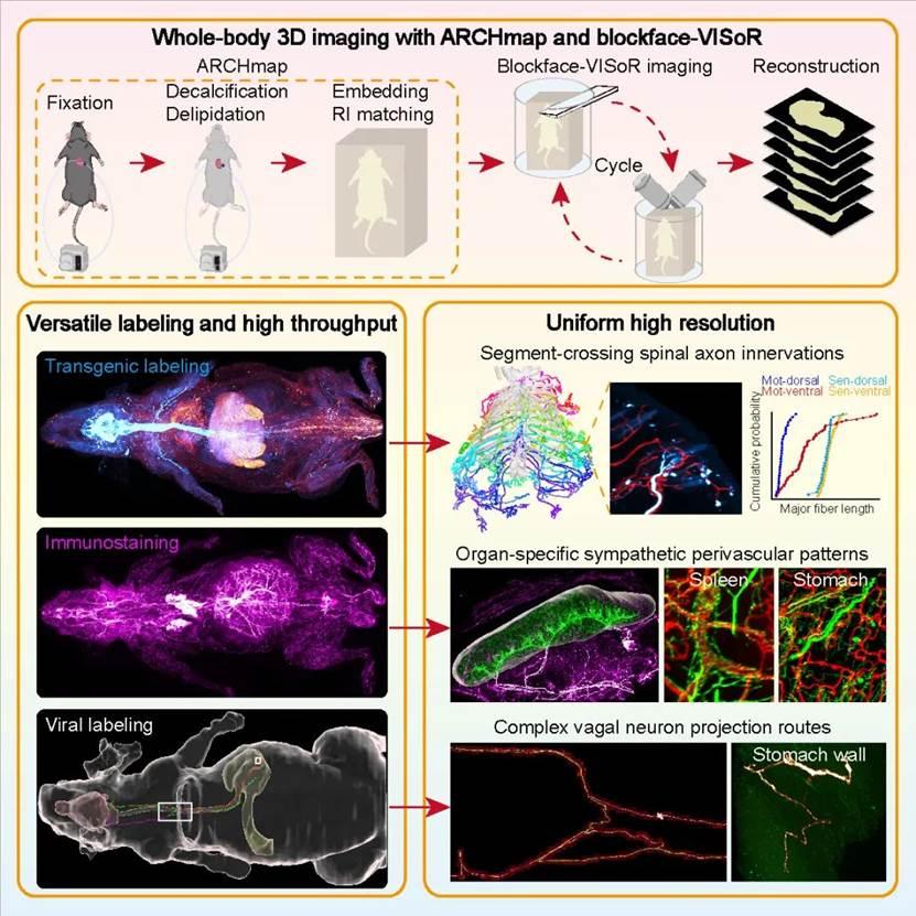 Due to the advantages of the sample preparation method with high fluorescence preservation, the ARCHmap-blockface-VISoR technologyCompatible with commonly used transgenic and neurotropic virus-carried fluorescent proteins in the field of neuroscience, as well as immunofluorescence and other labeling methods. By combining the above labeling and imaging techniques, researchers have successfully resolved the fine structures and single-fiber projection pathways of different types of peripheral nerves throughout the mouse body. This study reveals, for the first time, the segmental projection characteristics of single spinal neurons, clarifies the organ-specific vascular distribution patterns of sympathetic nerves throughout the body, and解析了迷走神经的整体投射构架and单纤维复杂投射路径.